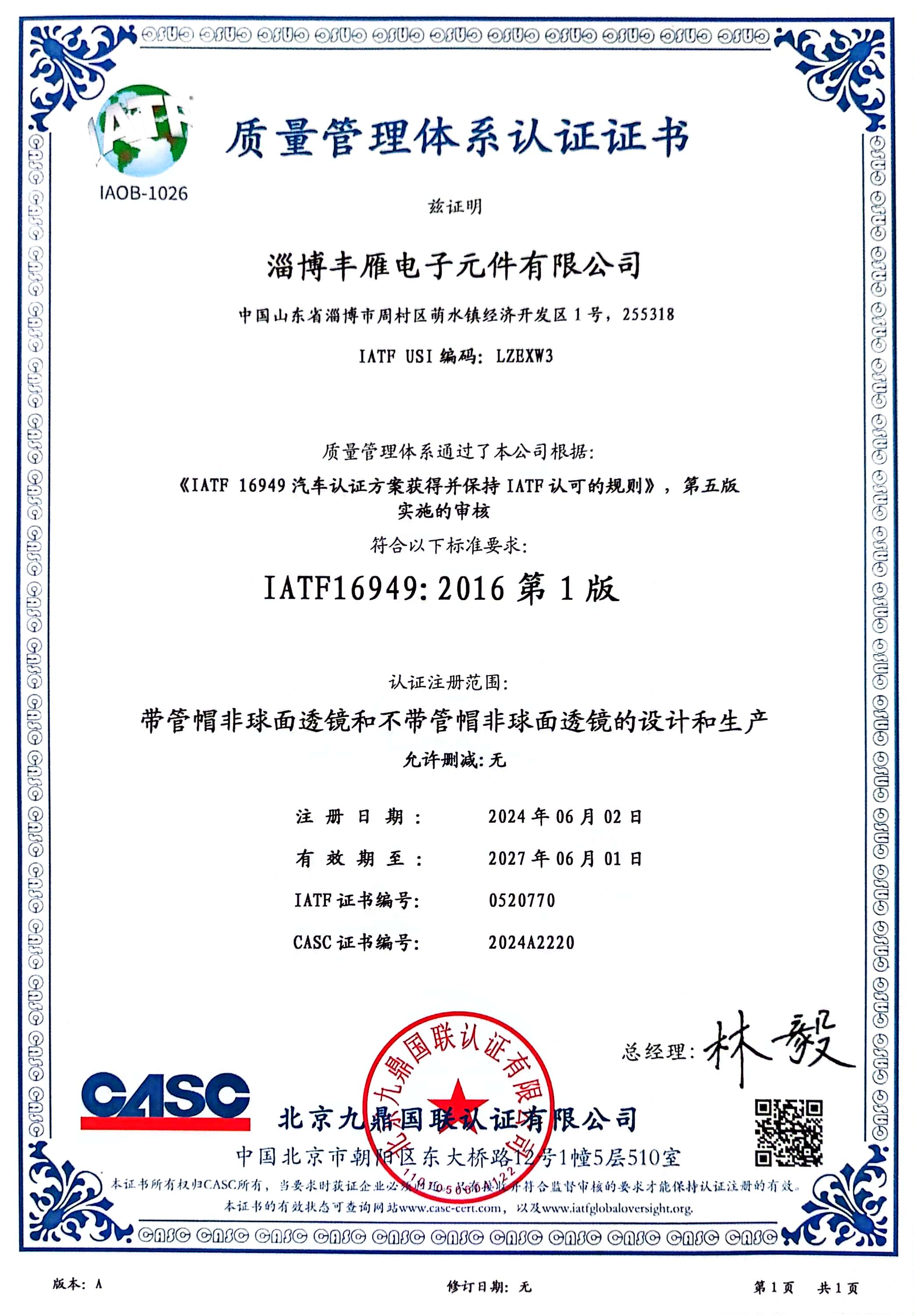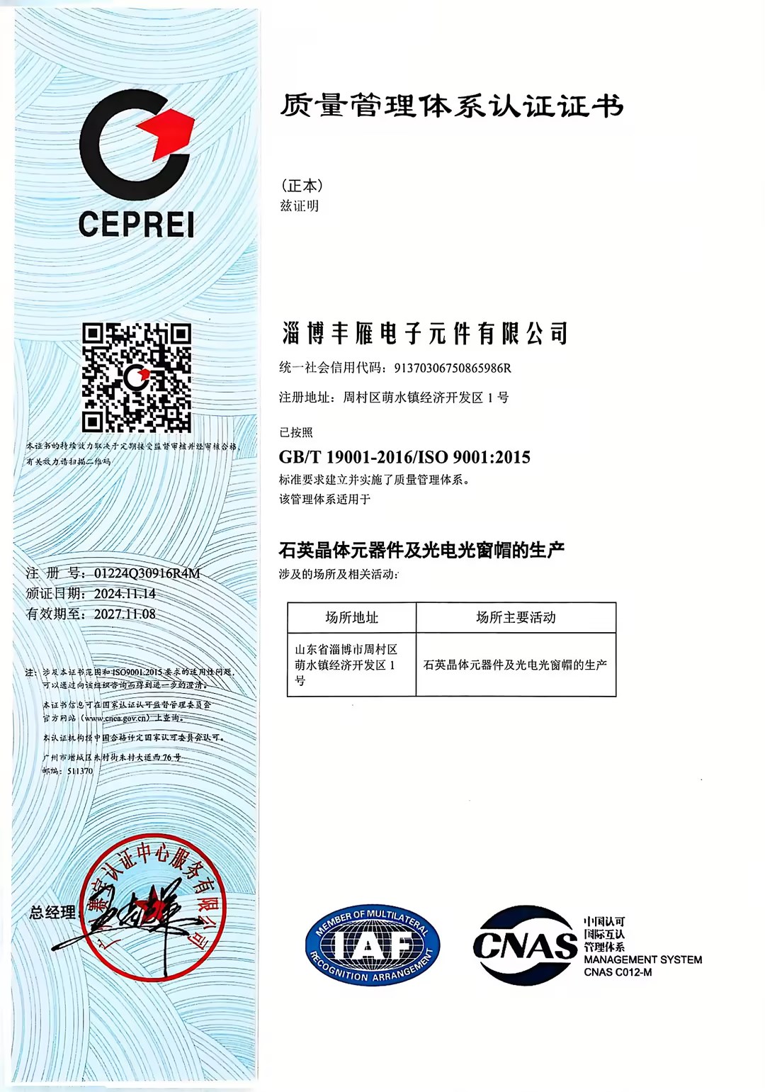 淄博豐雁電子元件有限公司,是一家集研發、生產、銷售為一體的透鏡管帽、晶體諧振器、晶體濾波器的高新技術企業。成立于1992年,坐落于山東省淄博市周村區,注冊資金1000萬元,擁有職工150余人,公司占地35000平方米,其中擁有5000平方的超凈化廠房,并配備了千級凈化工作臺,確保環境的凈化度。公司下設光電事業部,濾波器事業部,晶體事業部等多個事業部。專注為光通訊、激光器領域以及各種電子應用領域進行電子元件配套。公司于1999年通過了ISO9000質量體系認證,公司提供的所有產品符合歐盟的R0HS和REACH標準。公司擁有持續創新的研發團隊,有常年的外聘技術專家長期指導,并且與國內多所大學和光電研究所保持長期合作關系,確保了產品和技術的先進性,能持續為客戶提供高質量的產品和更好的全方位服務。